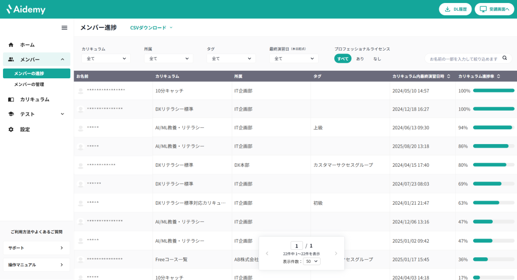 「管理画面>メンバー>メンバーの進捗」の画面より、カリキュラム進捗の確認ができます。