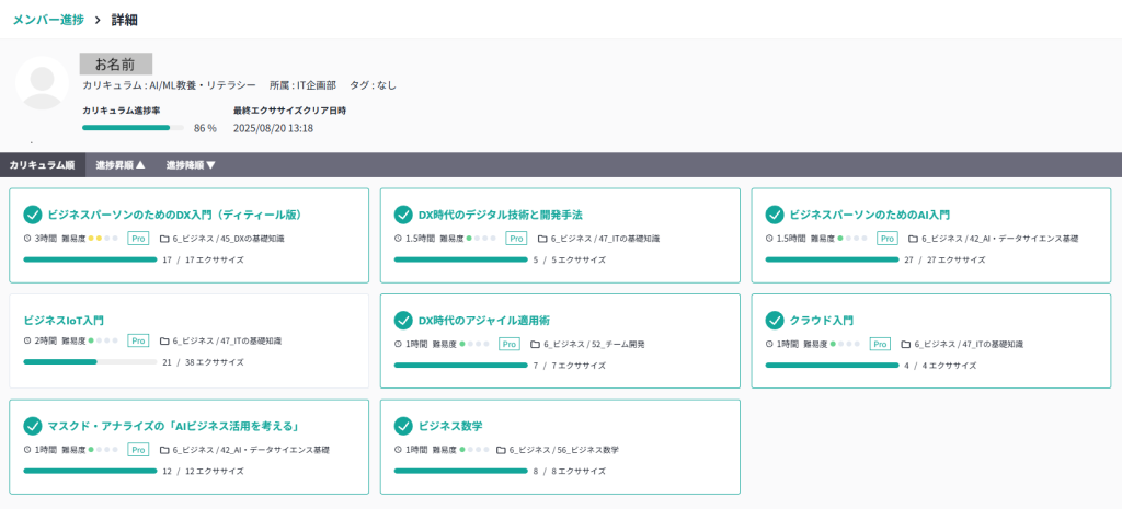 メンバーのお名前をクリックすると、メンバーがカリキュラム内で受講したコースの一覧が確認できます。
