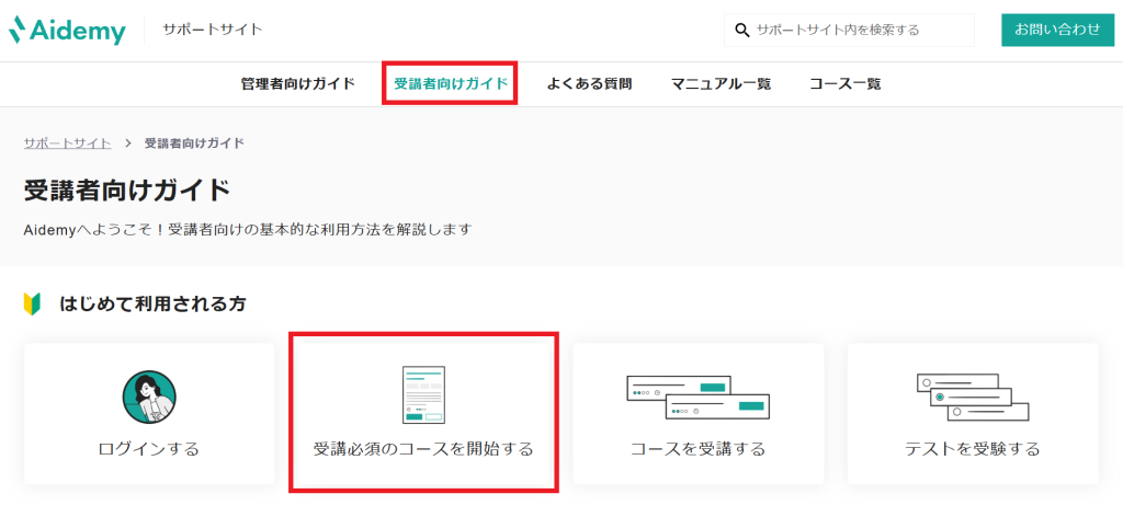 マイページについては、Aidemy Business/GXヘッダー上部にある「はじめての方へ>サポートサイト(受講者向けガイド)>はじめて利用する方」の「受講必須のコースを開始する」にて、画像サンプル付きでご説明しておりますので、併せてご確認ください。