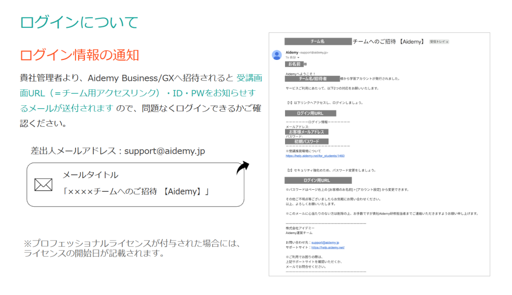 ログインに必要な情報(ログインURL、ID、パスワード)はAidemy Business/GXに招待された際に届く招待メールに記載されております。
