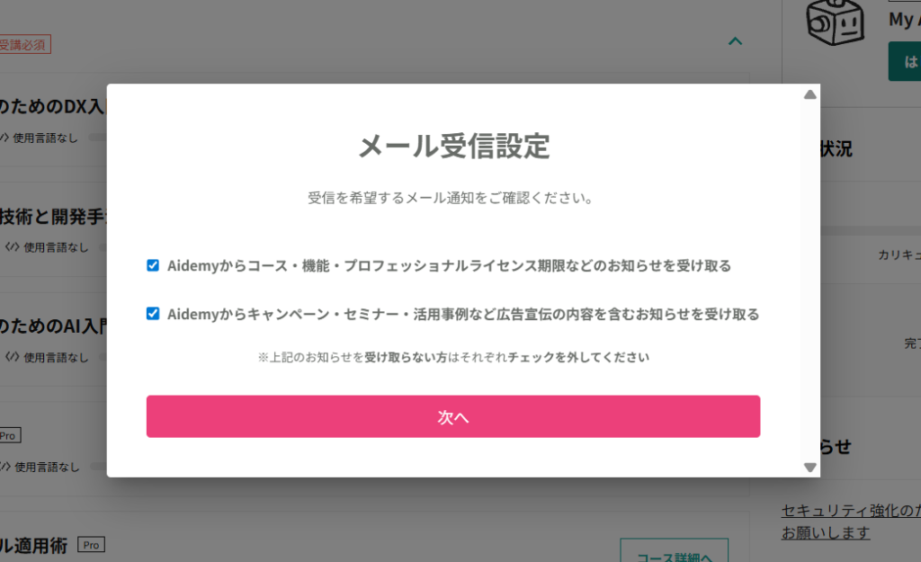 初回ログイン後「利用規約」「メール受信設定」「初回登録時のアンケート」のポップアップ表示が出ます。