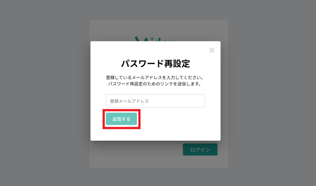 ログインURLにアクセス後「パスワードを忘れた場合」をクリックいただき、ご自身のメールアドレスを入力後「送信する」をクリックください。
