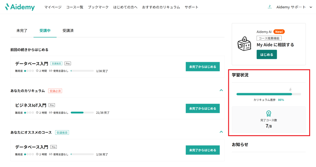 マイページに表示されている「あなたのカリキュラム(受講必須)」があなたに割り当てられたコースです。上に表示されているものから順に受講を推奨しております。