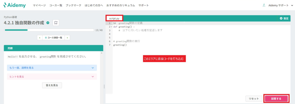 script.pyには課題の解答には不要なコードや模範解答とは異なる記法も記述できますし、実行もできます。いろいろ試しながら学習を進めてみてください。