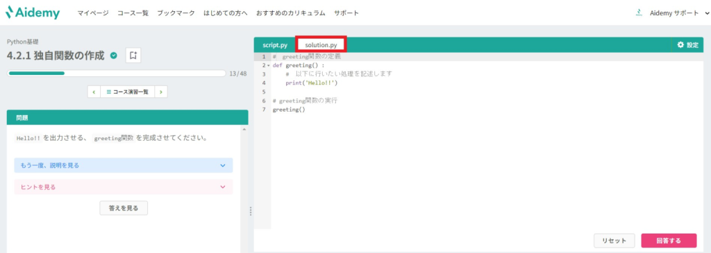 回答後、もしくは「答えを見る」をクリックするとsolution.pyのタブに模範解答が表示されます。リセットボタンを押すとコードが初期状態に戻ります。