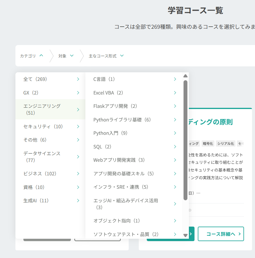 カリキュラムに関係なく、興味のあるコースを受講したい場合は、コース一覧から選択して受講が可能です。